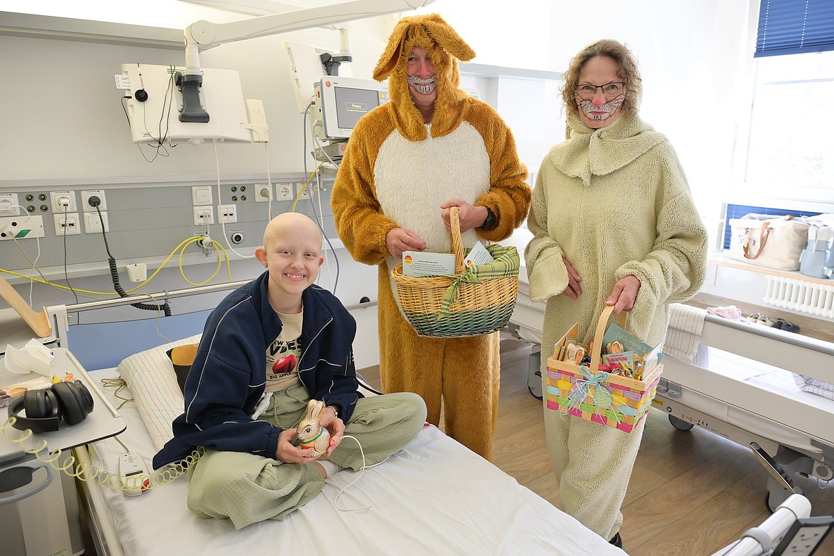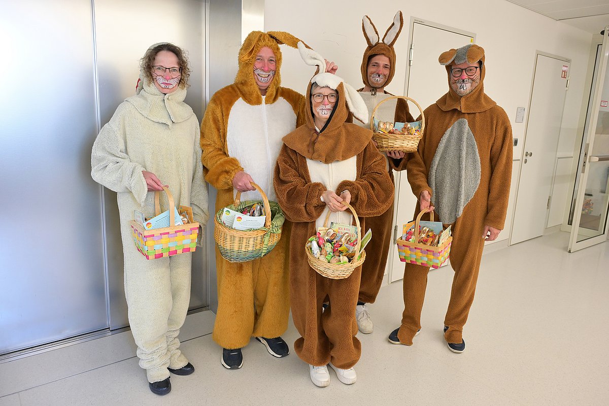 Langohren in fröhlicher Mission: Fünf flauschige Osterhasen hoppelten auch in diesem Jahr wieder durch die in Kinder- und Jugendklinik (Direktor: Prof. Dr. Joachim Wölfle) des Uniklinikums Erlangen, um den jungen Patientinnen und Patienten kurz vor den Feiertagen eine Freude zu machen. Entsandt wurden sie wieder einmal von der SPIE Efficient Facilities GmbH in Erlangen. Seit mehr als 20 Jahren schlüpfen wechselnde Beschäftigte der Firma nun schon in Hasenkostüme und halten so eine lieb gewonnene Ostertradition lebendig. Organisiert wird die Osterhasenvisite jedes Jahr vom Erzieherinnenteam der Kinderklinik.