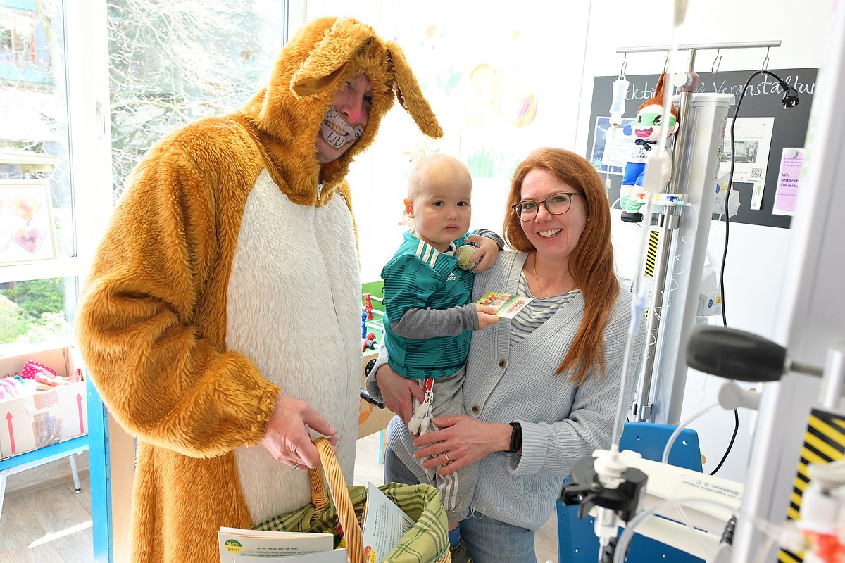 In der Kinderonkologie hieß es für die plüschigen Besucherinnen und Besucher schließlich nicht nur „schenken“, sondern auch „beschenkt werden“: „Halt, Osterhase! Ich will dir auch was geben“, sagte dort plötzlich ein kleiner Patient und überreichte „Hase“ Holger Kutz, SPIE-Niederlassungsleiter, kurzerhand ein selbst bemaltes Keramiklämmchen. „Das ist ja toll! Lieben Dank dir“, freute sich der Osterhase und hoppelte weiter zum nächsten Patientenzimmer.