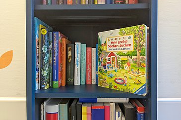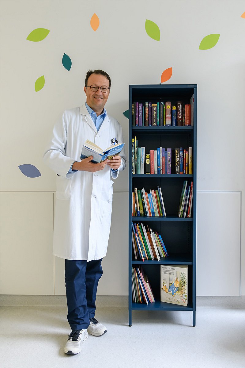 In engem Austausch mit der Kinderonkologie wählte Andrea K. ein passendes Möbelstück aus, kaufte und bestückte es. Rund 40 Bücher hat die Schlüsselfelderin selbst besorgt und ins Regal gestellt, weitere Werke wurden ihr von Verlagen zugeschickt. „Besonders bemerkenswert finde ich, dass bei der Auswahl tatsächlich an alle gedacht wurde: vom Kleinkind über Grundschüler und Jugendliche bis hin zu den Eltern, die ihre Kinder zu uns in die Klinik begleiten“, freut sich Prof. Dr. Markus Metzler, Leiter der Kinderonkologie. „Uns war es ein Anliegen, Bücher zum gemeinsamen Ansehen und Vorlesen anzubieten – eine Alternative zum Daddeln auf dem Smartphone oder dem Tablet.“ Zudem sei der neue Bücherschrank eine tolle Ergänzung zu den Spielen und Fahrzeugen, die bereits zum Zeitvertreib in dem Warteraum vorhanden sind.