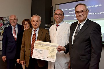 Bisher gibt es keine Möglichkeit, verletzte Stimmlippen wiederherzustellen und damit den Verlust der menschlichen Stimme rückgängig zu machen. Aus diesem Grund arbeitet ein Forschungsteam um Prof. Dr. Christoph Alexiou, Leiter der Sektion für Experimentelle Onkologie und Nanomedizin (SEON) an der Hals-Nasen-Ohren-Klinik - Kopf- und Halschirurgie (Direktor: Prof. Dr. Dr. h. c. Heinrich Iro) des Universitätsklinikums Erlangen, an einem innovativen Verfahren, das mithilfe von Magnetkraft Zellen zu neuen Gewebestrukturen - zum Beispiel zu Stimmlippen - zusammenfügt. Um dieses Projekt zu unterstützen, überreichten Vertreter der Manfred-Roth-Stiftung jetzt (06.12.2017) einen Spendenscheck über 33.500 Euro an Prof. Alexiou. Die Summe wird von der Forschungsstiftung Medizin am Uni-Klinikum Erlangen auf insgesamt 50.250 Euro aufgestockt.