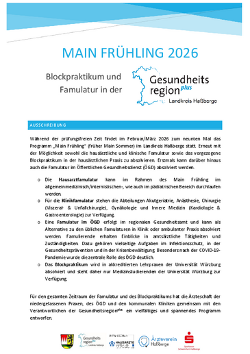 „Main Frühling 2026“ - Famulaturen (hausärztlich, klinisch & ÖGD) im Landkreis Haßberge - Bewerbungen noch möglich