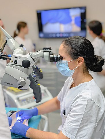 Die vier Teilnehmenden des ersten Jahrgangs begannen unter der Leitung der Studiengangvertreterin Prof. Dr. Kerstin Galler die klinisch orientierte Ausbildung nach aktuellen evidenzbasierten Standards und entsprechenden wissenschaftlichen Leitlinien. Im ersten Modul der Endodontologie, also der Lehre des Pulpa-Dentin-Komplexes und der Therapie von Erkrankungen ausgehend vom Wurzelkanalsystem, tauchten die Teilnehmenden mit Fallpräsentationen, theoretischen Vorträgen und praktischen Hands-on Modulen in dieses spannende zahnmedizinische Thema ein. Beim ersten praktischen Kurs zur endodontischen Zugangskavität für eine erfolgreiche Wurzelkanalbehandlung demonstrierte Prof. Dr. Kerstin Galler klinische Tipps und Tricks sowie die Handhabung des Dentalmikroskops. Im Anschluss hatten alle Teilnehmenden die Möglichkeit, das Gelernte selbst unter der faszinierenden Vergrößerung zu trainieren und wertvolle Erkenntnisse für den Praxisalltag zu gewinnen.