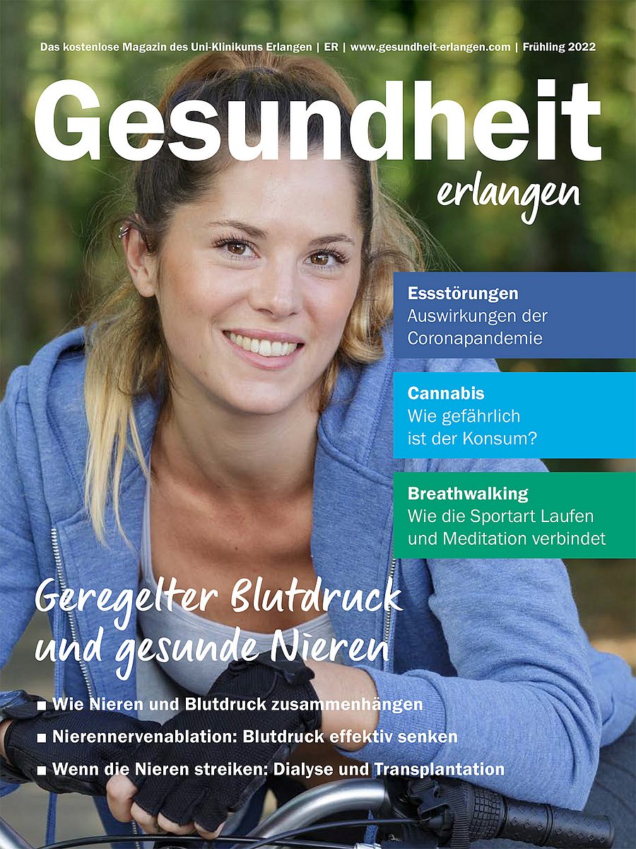 Auf welche Warnzeichen wir bei unserem Urin achten sollten und wer ihn regelmäßig untersuchen lassen sollte, darauf geht Prof. Dr. Mario Schiffer, Direktor der Medizinischen Klinik 4 – Nephrologie und Hypertensiologie des Universitätsklinikums Erlangen, im Schwerpunkt des Magazins ein. Der Experte erklärt, weshalb er von Urin-Selbsttests für daheim abrät und wie Menschen mit unzureichender Nierenfunktion therapiert werden können. Die Leserinnen und Leser erfahren außerdem die Geschichte einer jungen Fränkin, die dank der Lebendnierenspende ihrer Mutter nun nicht mehr auf die Dialyse angewiesen ist und ein neues Leben beginnen kann. Eine gesunde und salzarme Ernährung in Kombination mit ausreichend Bewegung spielt bei der Prävention und der Behandlung von Bluthochdruck eine entscheidende Rolle. Eine Anpassung des Lebensstils ist dringend erforderlich, um die Volkskrankheit in Schach zu halten, betont Prof. Dr. Roland Schmieder, Oberarzt der Medizin 4 des Uni-Klinikums Erlangen. Zusammen mit dem Spezialisten gehen die Redakteurinnen darüber hinaus der Frage nach, wie die noch recht junge Therapiemethode der Nierennervenablation z. B. Patientinnen und Patienten mit schwer einstellbarem Bluthochdruck einen Ausweg aus ihrer Erkrankung bieten kann.