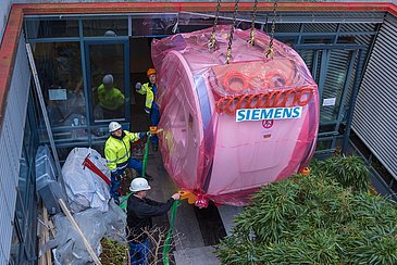 Bei Magnetom Vida handelt es sich um einen vollkommen neu entwickelten 3-Tesla-Magnetresonanztomografen von Siemens Healthineers. Das Exemplar, das heute ans Uni-Klinikum Erlangen geliefert wurde, ist das erste derartige Gerät in Nordbayern, eines der ersten in ganz Deutschland und sogar eines der ersten weltweit. Die Radiologie wird das Gerät in enger Zusammenarbeit mit Siemens Healthineers auch für wissenschaftliche Forschungsarbeiten einsetzen.