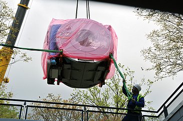 Ein MRT fliegt ein: Wer heute (19.04.2017) Morgen am Maximiliansplatz gen Himmel blickte, staunte nicht schlecht - hing da doch ein Magnetresonanztomograf am Haken! Mithilfe eines Autokrans wurde das neue Gerät in die Räume des Radiologischen Instituts (Direktor: Prof. Dr. Michael Uder) des Universitätsklinikums Erlangen gehievt. Insgesamt 7,5 t Gewicht bringt "Magnetom Vida" von Siemens Healthineers auf die Waage. Für den Transport des MRTs ins erste Untergeschoss des Internistischen Zentrums war neben Kraft auch viel Fingerspitzengefühl gefragt: Am Ende ging es darum, den Koloss Zentimeter für Zentimeter an seinen Bestimmungsort zu schieben. "Im Moment wird das Gerät noch fertig installiert", erklärt Prof. Dr. Rolf Janka, leitender Oberarzt der Radiologie. "In den kommenden zwei Wochen lernt unser Team die neue Technik kennen und wird intensiv geschult, bevor wir den ersten Patienten damit untersuchen."