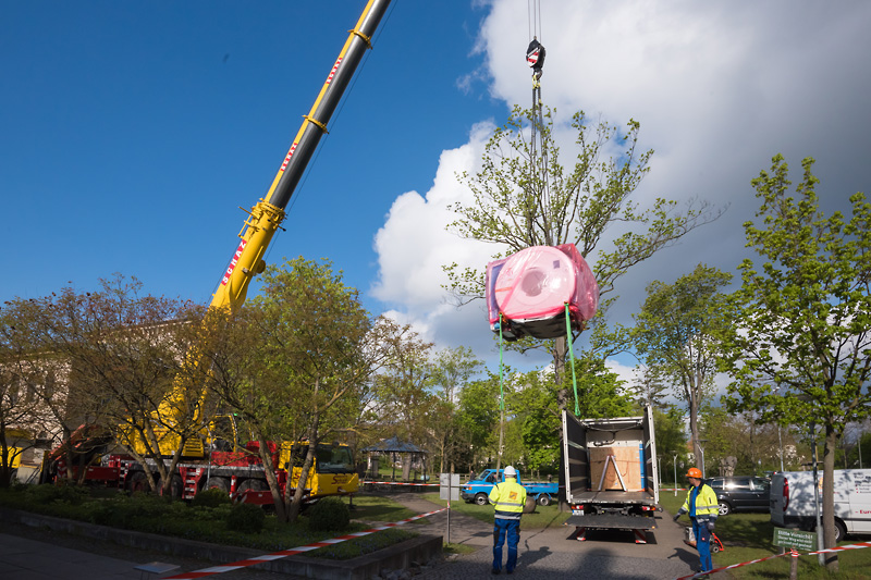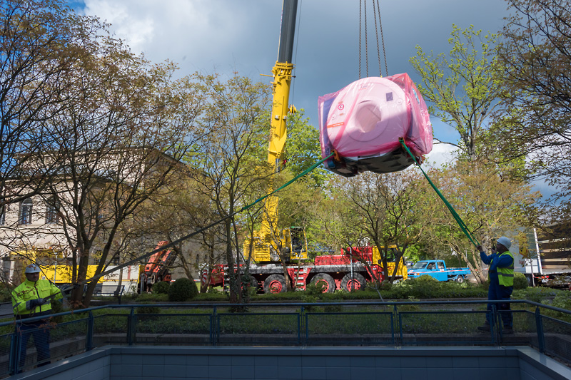 Ein MRT fliegt ein: Wer heute (19.04.2017) Morgen am Maximiliansplatz gen Himmel blickte, staunte nicht schlecht - hing da doch ein Magnetresonanztomograf am Haken! Mithilfe eines Autokrans wurde das neue Gerät in die Räume des Radiologischen Instituts (Direktor: Prof. Dr. Michael Uder) des Universitätsklinikums Erlangen gehievt. Insgesamt 7,5 t Gewicht bringt "Magnetom Vida" von Siemens Healthineers auf die Waage. Für den Transport des MRTs ins erste Untergeschoss des Internistischen Zentrums war neben Kraft auch viel Fingerspitzengefühl gefragt: Am Ende ging es darum, den Koloss Zentimeter für Zentimeter an seinen Bestimmungsort zu schieben. "Im Moment wird das Gerät noch fertig installiert", erklärt Prof. Dr. Rolf Janka, leitender Oberarzt der Radiologie. "In den kommenden zwei Wochen lernt unser Team die neue Technik kennen und wird intensiv geschult, bevor wir den ersten Patienten damit untersuchen."