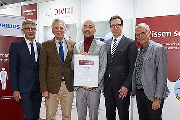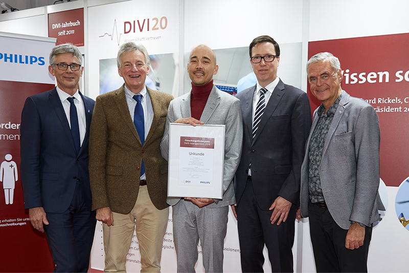 Der Forschungsförderpreis Delir-Management, der von der Deutschen Interdisziplinären Vereinigung für Intensiv- und Notfallmedizin (DIVI) e. V. und der Philips GmbH im Rahmen des DIVI-Kongresses 2019 vergeben wurde, ging dieses Jahr nach Erlangen. Der Oberarzt PD Dr. Joji Kuramatsu, der Assistenzarzt Dr. Jochen Sembill und der Stationsleiter Markus Prinz an der Neurologischen Klinik (Direktor: Prof. Dr. Dr. h. c. Stefan Schwab) des Universitätsklinikums Erlangen nahmen die mit 10.000 Euro dotierte Auszeichnung stolz entgegen. Das multiprofessionelle Team erforscht die Bedeutung der zirkadianen Beleuchtung in der Delir-Prävention und –Therapie, also einer Beleuchtung, die auf der Station den natürlichen 24-Stunden-Rhythmus nachbildet.