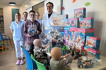 Eine gute Idee: Um das Spielen vor Publikum zu üben und gleichzeitig Geld für den guten Zweck zu sammeln, stellte sich der 12-jährige Max mit seiner Querflöte und der Bitte um eine Spende für die Kinderonkologie (Leiter: Prof. Dr. Markus Metzler) des Uniklinikums Erlangen in die Erlanger Fußgängerzone. Die Passantinnen und Passanten spendeten insgesamt rund 300 Euro, mit denen Max schließlich verschiedene Playmobil-Sets für die jungen Krebspatientinnen und -patienten kaufte. Diese übergab der Schüler des musischen Christian-Ernst-Gymnasiums nun an Prof. Metzler, Stationsleiterin Maresa Siebert und die Gesundheits- und Kinderkrankenpflegerinnen Vanessa Gärtner und Ronja Stark.