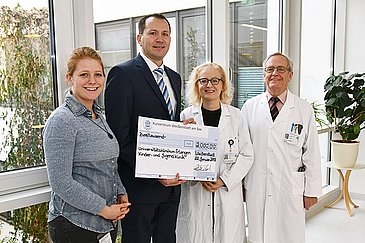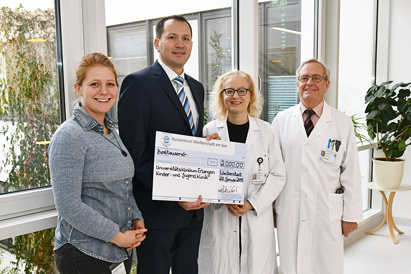 Reik Eilert, Direktor des Kurzentrums Weißenstadt am See, ist Vater zweier Kinder. "Dass Familien mit sterbenskranken Kindern von Erlangen aus durch ein mobiles Palliativteam betreut werden, war mir gar nicht so bewusst", erklärte er am heutigen Dienstag (23.01.2019). Ein Radiobeitrag mit Prof. Dr. Dr. h. c. Wolfgang Rascher, Direktor der Kinder- und Jugendklinik des Universitätsklinikums Erlangen, habe Reik Eilert darüber nachdenken lassen, an das Erlanger Kinderpalliativteam zu spenden. Nun überreichte er einen Scheck in Höhe von 2.000 Euro an Prof. Rascher, Dr. Chara-Gravou-Apostolatou, Leiterin des Kinderpalliativteams, und Michelle Dotzauer, ebenfalls Mitarbeiterin des Kinderpalliativteams. Das Geld stammt aus einer Silvester-Tombola des Kurzentrums, an der sich 200 Hotelgäste beteiligten und für den guten Zweck Lose kauften. Zu gewinnen gab es unter anderem Therapie- und Kosmetikanwendungen im Kurzentrum, das sich auf die Linderung von Rheumabeschwerden spezialisiert hat.