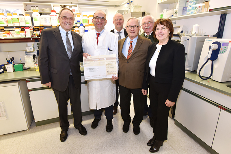 Am heutigen Montag (17.12.2018) übergaben Dr. Wilhelm Polster, Vorstand der Manfred-Roth-Stiftung, und Stiftungsrat Klaus J. Teichmann einen Scheck in Höhe von 40.000 Euro an Prof. Dr. Christoph Alexiou, Leiter der Sektion für Experimentelle Onkologie und Nanomedizin (SEON) der Hals-Nasen-Ohren-Klinik – Kopf- und Halschirurgie (Direktor: Prof. Dr. Dr. h. c. Heinrich Iro) des Universitätsklinikums Erlangen. Das Geld wird dank des Matching-Funds-Programms der Forschungsstiftung Medizin am Uni-Klinikum Erlangen auf insgesamt 54.000 Euro aufgestockt. Damit werden im SEON Geräte für das "Upscaling" von Eisenoxid-Nanopartikeln finanziert, die zukünftig als neuartige Kontrastmittel fungieren sollen. Ziel ist es, die Partikel schnellstmöglich vom Labor in die Produktion bzw. in die klinische Anwendung zu überführen. In diesem Bereich arbeiten die Mitarbeiter des SEON eng mit der Apotheke (Chefapotheker: Prof. Dr. Frank Dörje) des Uni-Klinikums Erlangen zusammen, die über Herstellungsräume für Arzneimittel verfügt.