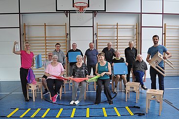 Dank der großzügigen Spende konnten Dr. Gaßner und sein Team nun neue Materialien für die Parkinson-Rehasportgruppe, aber auch für die Durchführung der zahlreichen Bewegungsstudien der Molekularen Neurologie des Uni-Klinikums Erlangen, anschaffen. So stehen nun zum Beispiel eine Koordinationsleiter und mehrere Balance-Kissen aus Schaumstoff zur Förderung von Gleichgewicht und Koordination im Sinne der Sturzprophylaxe und Gangsicherheit zur Verfügung. Außerdem können die Teilnehmerinnen und Teilnehmern ihre Übungen nun auf 15 stabilen und altersgerechten Holzhockern ausführen. „Die angenehme Sitzhöhe reduziert das Risiko von Stürzen beim Aufstehen und Hinsetzen deutlich“, betont Heiko Gaßner. „Besonders freuen wir uns über die neue Bluetooth-Lautsprecherbox, da wir viel mit Musik arbeiten. Sie dient zur Rhythmusschulung und verbessert die Gangkoordination bei der Rehasportgruppe.“