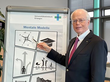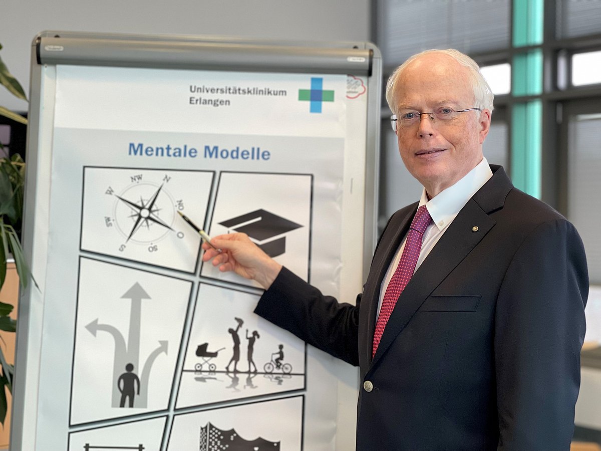 Neben der Boulderpsychotherapie liegt der Fokus der neuen Studie auch auf der Arbeit mit Mentalen Modellen. Dabei handelt es sich um universelle Regeln, die im privaten und beruflichen Leben angewendet werden, um relevante Informationen herauszufiltern und die Informationsflut auf ein verarbeitbares Maß zu reduzieren. „Diese Abkürzungen führen aber häufig zu sogenannten Denkfehlern, denen wir alle – unabhängig von Depressionen – unterliegen“, erläutert Prof. Dr. Johannes Kornhuber, Direktor der Psychiatrie des Uniklinikums Erlangen, der diese Therapieform entwickelt hat. „In der Therapie mit Mentalen Modellen versuchen wir, diese Denkfehler zu verstehen, um uns nicht mehr von ihnen in die Irre führen zu lassen und in Zukunft bessere Entscheidungen für uns selbst zu treffen.“ Im Rahmen der Studie „Neue Wege aus der Depression“ soll deshalb die Bildung von hilfreichen und zielführenden Mentalen Modellen geschult werden, die zu einer objektiveren Sicht auf die Welt, zum klügeren Umgang mit Zeit und Ressourcen sowie zu schnelleren, sichereren und schlaueren Entscheidungen führen.