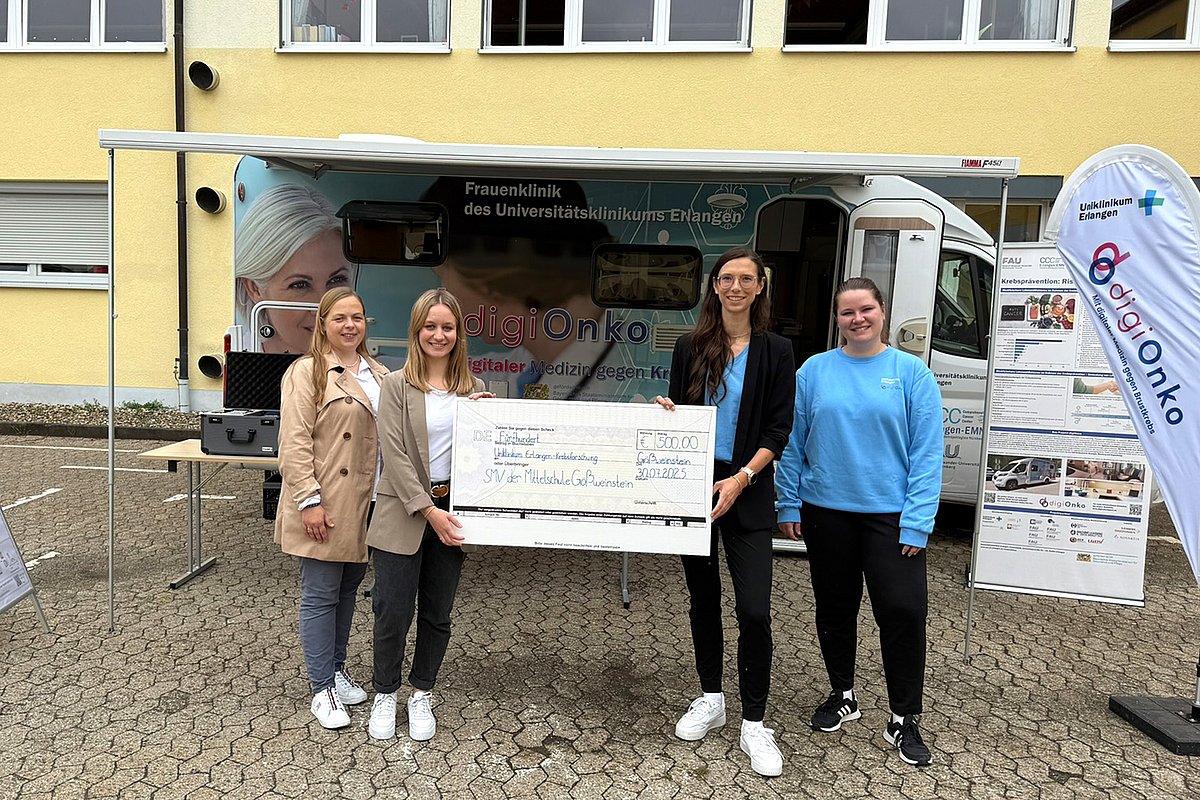 Seit wann kommt der Nikolaus denn im Sommer? Die Antwort: Seit die Schülerinnen und Schüler der Grund- und Mittelschule Gößweinstein bei ihrer Nikolausaktion im vergangenen Jahr 500 Euro für die Krebsforschung des Comprehensive Cancer Center Erlangen-EMN (Direktor: Prof. Dr. Matthias W. Beckmann) des Uniklinikums Erlangen gesammelt haben. Nun übergaben sie ihren Spendenscheck in die Hände von PD Dr. Hanna Hübner, wissenschaftliche Mitarbeiterin der Frauenklinik (Direktor: Prof. Dr. Matthias W. Beckmann), und Laura Bernhardt, Projektmanagerin am CCC Erlangen-EMN. „Diese Spende zeigt das beeindruckende Engagement der Kinder und Jugendlichen – ein lebendiges Beispiel dafür, wie schon junge Menschen Verantwortung für Gesundheit, Forschung und Prävention übernehmen können“, lobte Laura Bernhardt. „Herzlichen Dank!“