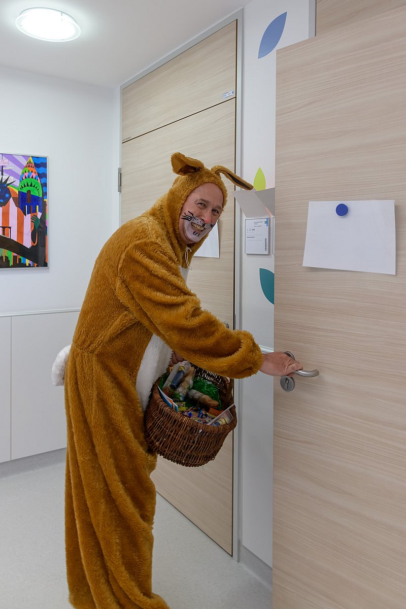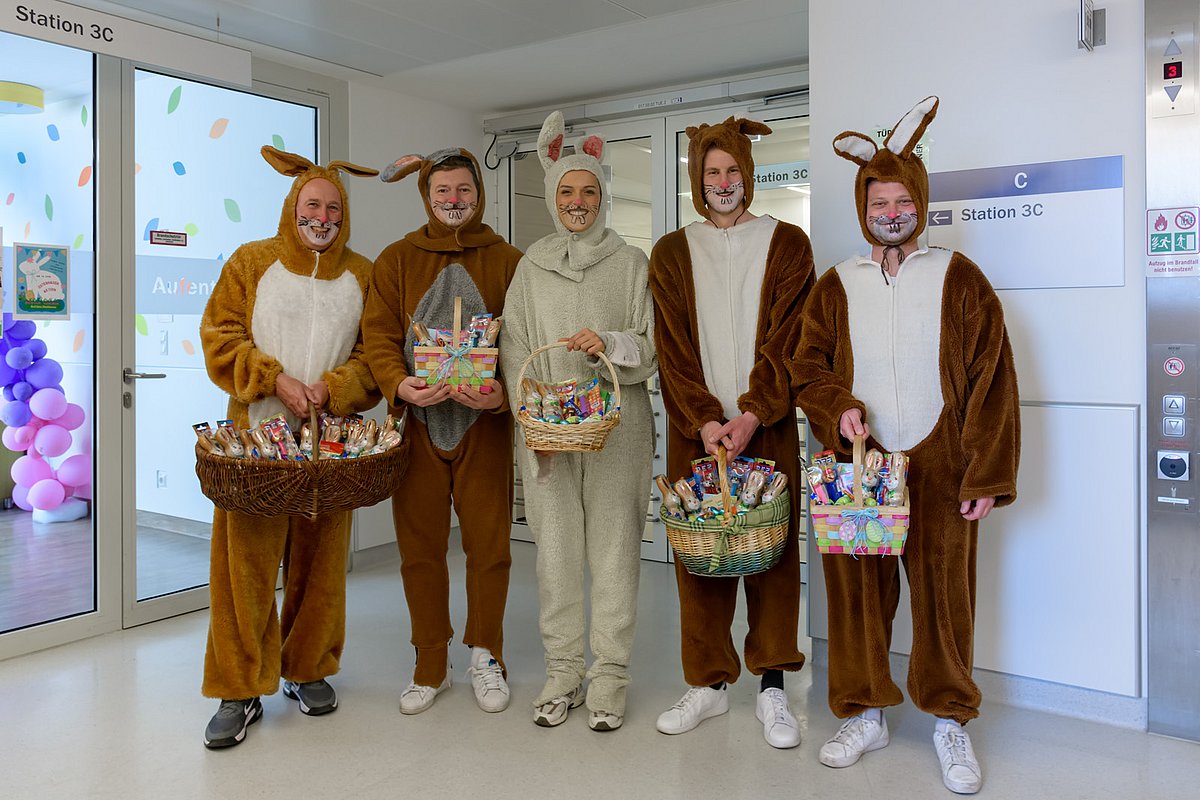 Erst Pfoten desinfizieren, dann Präsente verteilen: Fünf Osterhasen hoppelten kürzlich durch die Gänge der Kinder- und Jugendklinik des Uniklinikums Erlangen. Die plüschigen Überraschungsgäste verteilten Süßigkeiten und kleine Geschenke sowohl an die jungen Patientinnen und Patienten als auch an deren Eltern – und sorgten überall für strahlende Gesichter. In den Kostümen steckten eine Mitarbeiterin und vier Mitarbeiter der SPIE Efficient Facilities GmbH. „Das ist eine hasenstarke Aktion!“, sagte Marion Müller, leitende Erzieherin der Kinderklinik. „Diese Osterhasenvisite gibt es mittlerweile seit über 20 Jahren. Zu jedem Osterfest kommt verlässlich ein Team der Firma SPIE. Dafür sind wir sehr dankbar.“