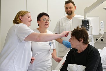 Genau diese Kooperation, über Berufsgruppen hinweg, wird auf der Ausbildungsstation ebenfalls gefördert. Prof. Dr. Oliver Schnell, Direktor der Neurochirurgie, betont: „Ich kannte das Konzept Ausbildungsstation schon, bevor ich 2022 nach Erlangen kam, und wusste, welches riesige Potenzial das hat. Langfristig soll es am Uniklinikum Erlangen hin zu einem interprofessionellen, also berufsgruppenübergreifen Ansatz gehen: Pflegeauszubildende und Medizinstudierende lernen von Anfang an gemeinsam und finden eine gemeinsame Sprache. Das wünscht sich der medizinische Nachwuchs und den wollen wir gewinnen“, so der Neurochirurg. Die Pflegedienstleitung der Kopfkliniken, Manuela Haß, ist zufrieden: „Dieser Support, der von der ersten Minute an da war, ist großartig und motivierend! Wir freuen uns unheimlich, dass auch so viele Ärztinnen und Ärzte das Projekt mittragen und unterstützen.“