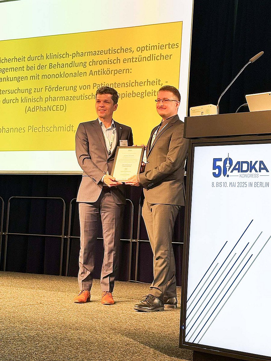 Über eine halbe Million Menschen leiden in Deutschland unter chronisch-entzündlichen Darmerkrankungen wie Morbus Crohn und Colitis ulcerosa (CED). Einem multiprofessionellen Ansatz für ein optimiertes Nebenwirkungsmanagement bei der Therapie widmete Dr. Johannes Plechschmidt, Leiter der Pharmazeutischen Logistik der Apotheke (Chefapotheker: Prof. Dr. Frank Dörje) des Uniklinikums Erlangen, seine Dissertation. Dazu begleitete er in einer interprofessionellen Pilotstudie mit Oberarzt Prof. Dr. Raja Atreya von der Medizinischen Klinik 1 – Gastroenterologie, Pneumologie und Endokrinologie (Direktor: Prof. Dr. Markus F. Neurath) des Uniklinikums Erlangen zwölf Monate lang eine CED-Patientengruppe, die mit Tumor-Nekrose-Faktor-Antikörpern (Anti-TNF) therapiert wurde. „Dabei stellten wir fest, dass CED-Patientinnen und -Patienten mit einer klinisch-pharmazeutischen Betreuung weniger therapiebedingte Nebenwirkungen erleiden als die Vergleichsgruppe ohne eine solche Betreuung“, erklärt Dr. Plechschmidt. Für seine Dissertation wurde der Pharmazeut von einer siebenköpfigen Jury im Rahmen des 50. wissenschaftlichen Kongresses des Bundesverbandes Deutscher Krankenhausapotheker (ADKA) e. V. in Berlin mit dem ADKA-Promotionspreis 2025 geehrt. Die Auszeichnung wurde insgesamt zum 15. Mal verliehen und ist heuer mit 6.000 Euro dotiert. Seit 2011 ging der Promotionspreis nun bereits zum dritten Mal an Wissenschaftler des Uniklinikums Erlangen.