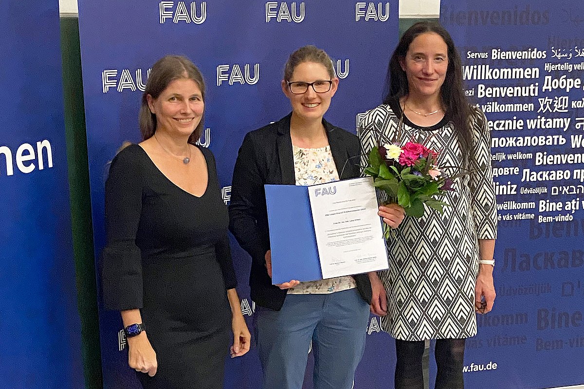 Dreifache Auszeichnung am Uniklinikum Erlangen: Eine Publikation sowie zwei Abschlussarbeiten wurden im Rahmen der Absolvierendenfeier 2024 der Medizinischen Fakultät der FAU Erlangen-Nürnberg für die Studiengänge „Bachelor Molekulare Medizin“, „Master Molecular Medicine“ und „Master Medical Process Management“ mit Preisen bedacht. Dr. Lena Erkert, wissenschaftliche Mitarbeiterin der Medizinischen Klinik 1 – Gastroenterologie, Pneumologie und Endokrinologie (Direktor: Prof. Dr. Markus F. Neurath) des Uniklinikums Erlangen, erhielt den Elke Lütjen-Drecoll-Publikationspreis. Für seine Promotionsarbeit wurde Dr. Alexander German, Arzt der Molekular-Neurologischen Abteilung (Leiter: Prof. Dr. Jürgen Winkler) des Uniklinikums Erlangen, mit dem Promotionspreis der Forschungsstiftung Medizin am Uniklinikum Erlangen geehrt. Magdalena Bolsinger, Mitarbeiterin der Molekular-Neurologischen Abteilung, erhielt für ihre Masterarbeit den Luise Prell-Preis.