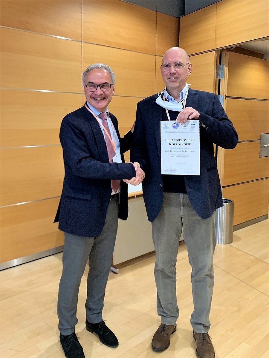 Prof. Dr. Matthias W. Beckmann, Direktor der Frauenklinik des Uniklinikums Erlangen, erhielt jetzt das erstmalig verliehene Ehrendiplom der Kolposkopie für besondere Dienste in der Kolposkopie – einer Untersuchung zur Erkennung gynäkologischer Krebserkrankungen. Überreicht wurde ihm das Diplom im Rahmen des 64. Kongresses der Deutschen Gesellschaft für Gynäkologie und Geburtshilfe e. V. (DGGG) in München von PD Dr. Volkmar Küppers, Vorsitzender der Arbeitsgemeinschaft Zervixpathologie und Kolposkopie e. V. (AG CPC).
