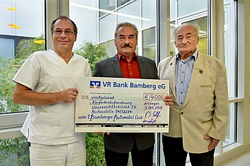 Das Würgauer Bergrennen, veranstaltet vom 1. Bamberger Automobilclub e. V., streichen sich mittlerweile nicht nur Rennsportfreunde im Kalender an, sondern auch zahlreiche interessierte Zuschauer. Die Organisatoren rückten in diesem Jahr einen besonders guten Zweck in den Fokus: Die Spenden- und Eintrittsgelder der Zuschauer in Höhe von 4.000 Euro flossen an die Kinderkrebsforschung der Kinder- und Jugendklinik (Direktor: Prof. Dr. Dr. h. c. Wolfgang Rascher) des Universitätsklinikums Erlangen. Jetzt (09.10.2017) nahm Oberarzt PD Dr. Klaus-Daniel Stachel die Summe im Namen seiner jungen Patienten und der Erlanger Kinderonkologie entgegen.