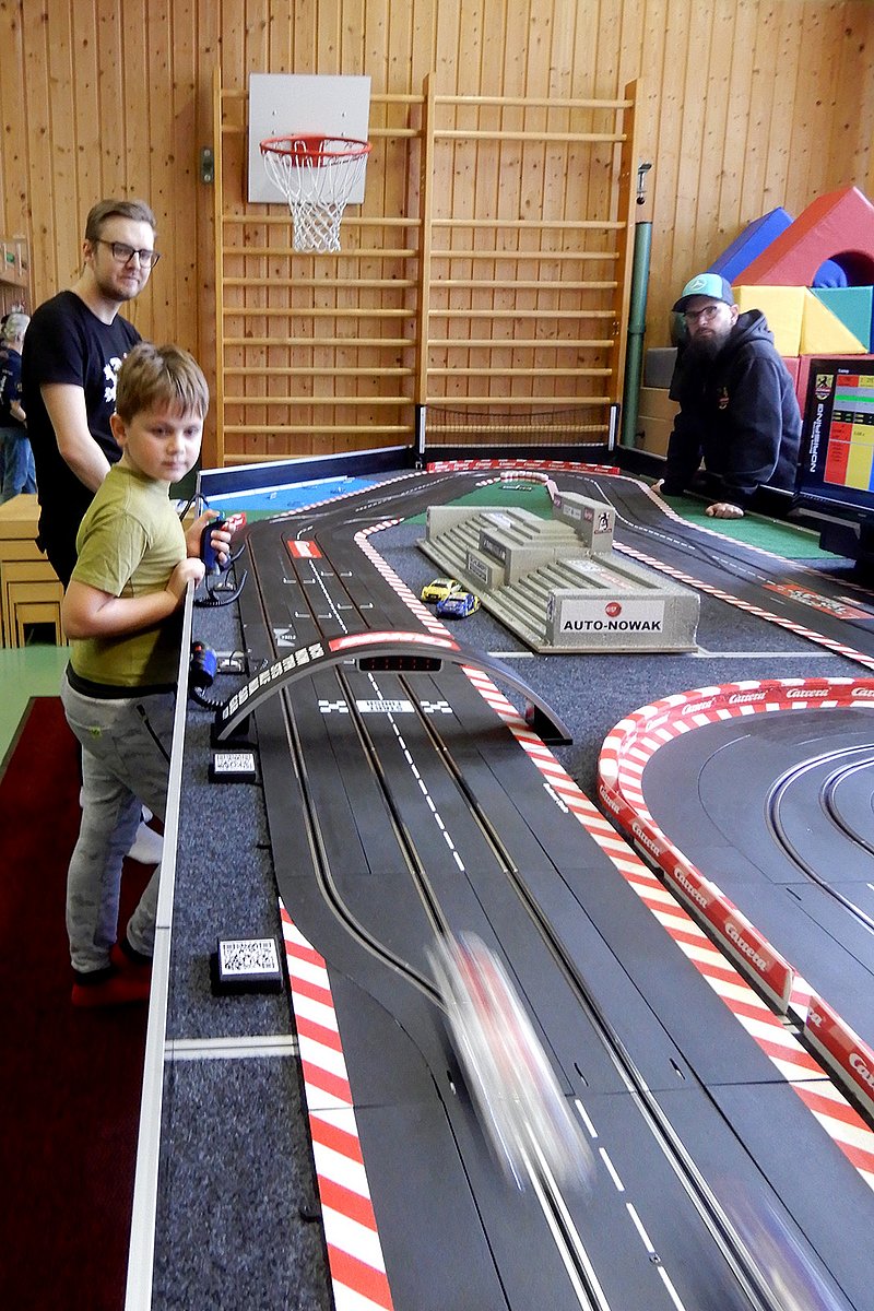 Er ist 2,3 Kilometer lang, verläuft über acht Kurven und wird jedes Jahr im Juli vor der Zeppelinhaupttribüne auf dem ehemaligen Reichsparteitagsgelände aufgebaut: der Stadtkurs des bekannten Nürnberger Norisringrennens. Nun war die Autorennstrecke vor Kurzem auch in der Kinder- und Jugendklinik des Uniklinikums Erlangen zu finden – und zwar als maßstabsgetreues Carrera-Bahn-Modell. Denn: Der Herzo Racing e. V. besuchte die jungen Patientinnen und Patienten, die dort in Behandlung sind, für einen Nachmittag mit seinem mobilen Nachbau inklusive Grundig-Kehre, Schöller-S, Dutzendteich-Kehre und Steintribüne. In zahlreichen Rennen gingen die Kinder gemeinsam mit ihren Eltern und Geschwistern, aber auch mit Pflegefachkräften und anderem medizinischen Personal an den Start – und hatten dabei sichtlich Spaß. Organisiert wurde das Event vom Verein in enger Zusammenarbeit mit dem Erzieherinnenteam der Kinderklinik.