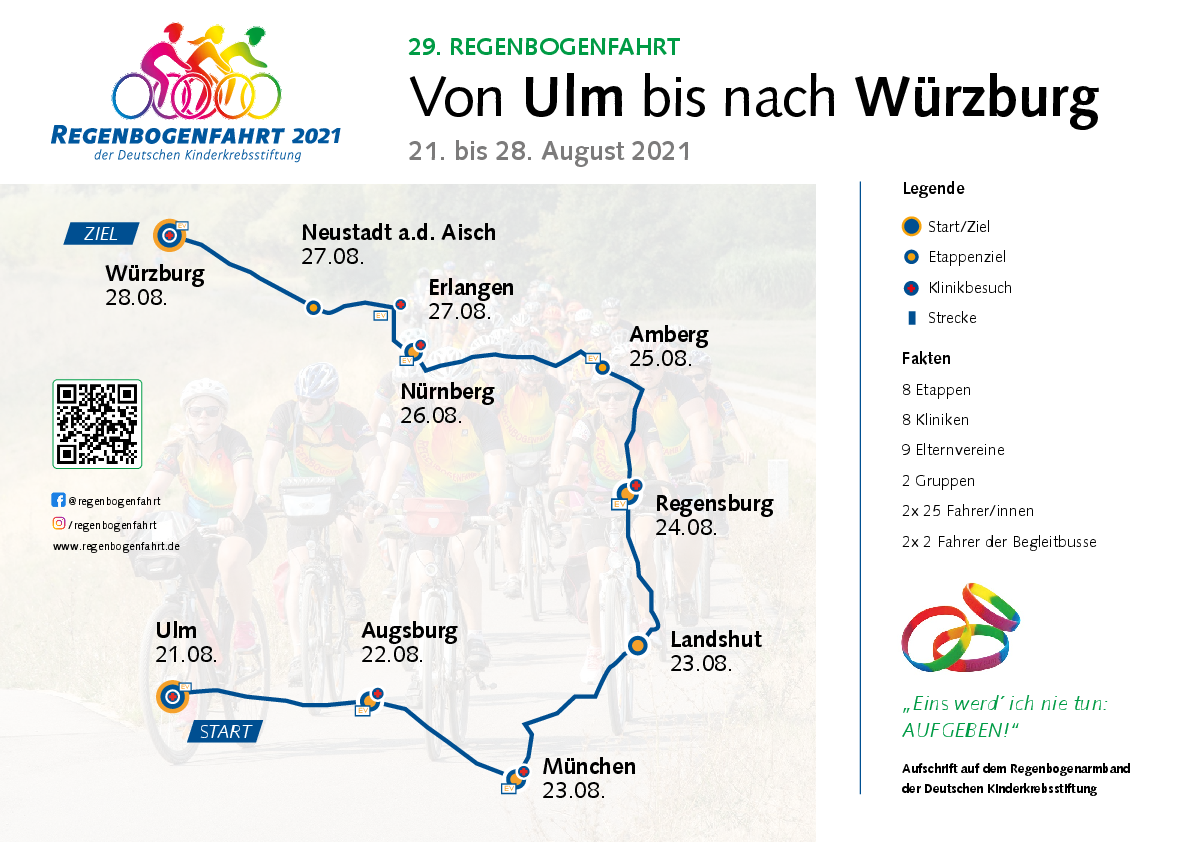 Die Regenbogenfahrt ist beeindruckend und außergewöhnlich. Zum einen für die Teilnehmer, die mehrere hundert Kilometer mit dem Fahrrad unterwegs sind. Zum anderen ist es für die akut erkrankten jungen Patienten ein Zeichen der Hoffnung, das für sie einen ganz speziellen Stellenwert hat. Denn auf ihrer Route besuchen die Fahrer krebskranke Kinder in den Kliniken, um ihnen Mut zuzusprechen.
