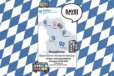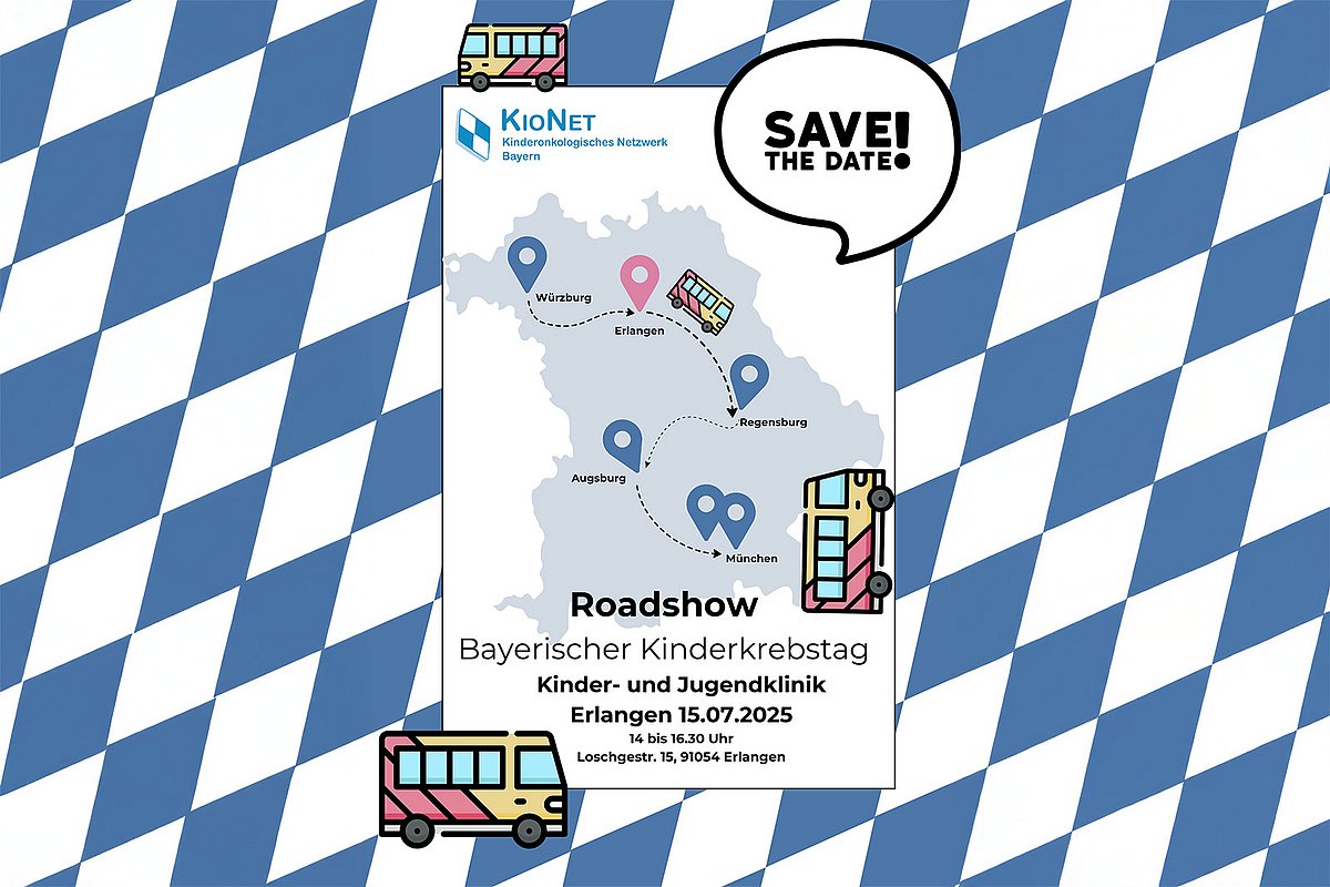 Das Kinderonkologische Netzwerk Bayern (KIONET) lädt im Rahmen des 2. Bayerischen Kinderkrebstags vom 15. bis 17. Juli 2025 zu einer Roadshow ein, die an den verschiedenen Standorten des Netzwerks haltmacht. Auch das Uniklinikum Erlangen ist als eines von sechs beteiligten bayerischen Universitätsklinika dabei und gibt Interessierten bewegende und spannende Einblicke in die Arbeit des Kinderonkologischen Zentrums (Sprecher: Prof. Dr. Markus Metzler). Besucherinnen und Besucher dürfen sich am Dienstag, 15. Juli 2025, von 14.00 bis 16.30 Uhr in der Erlanger Kinderklinik auf Informationen, Austausch und ein buntes Rahmenprogramm freuen.