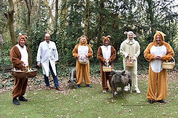 Plüschiges Fell, lange Löffel und gleich fünf Körbe voller süßer Überraschungen zwischen den Pfoten – das konnten nur Osterhasen sein, die da in der Kinder- und Jugendklinik (Direktor: Prof. Dr. Joachim Wölfle) des Universitätsklinikums Erlangen unterwegs waren. Bereits seit 2004 ist es Tradition, dass Mitarbeitende des Multitechnik-Dienstleisters SPIE als hoppelnde Osterboten den jungen Patientinnen und Patienten eine Freude bereiten. „Die Hasenkostüme und kleinen Geschenke machen nicht nur unseren Jüngsten gute Laune – wir alle freuen uns jedes Jahr aufs Neue über diesen besonderen Besuch. Im Namen der gesamten Kinderklinik möchte ich mich herzlich bei den engagierten Mitwirkenden bedanken“, sagte Prof. Wölfle.