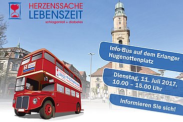 Zwischen Mai und August 2017 tourt ein roter "Schlaganfall-Infobus" unter dem Motto "Herzenssache Lebenszeit" durch Deutschland. Ziel ist es, über die Symptome und Risikofaktoren eines Schlaganfalls zu informieren und die Bevölkerung für die Erkrankung zu sensibilisieren. Am Dienstag, 11. Juli 2017, legt der Bus einen Halt in Erlangen ein. Auf dem Hugenottenplatz informieren Ärzte und Pflegekräfte der Neurologischen Klinik (Direktor: Prof. Dr. Dr. h. c. Stefan Schwab) des Universitätsklinikums Erlangen über Risiken und Prävention eines Schlaganfalls. Auch die Ernährungsberatung der AOK Bayern, Geschäftsstelle Erlangen, und der Kreisverband Erlangen-Höchstadt des Bayerischen Roten Kreuzes beteiligen sich an der Kampagne und beraten Interessierte vor Ort. Unterstützt wird die Aktion auch durch den Erlanger Oberbürgermeister Dr. Florian Janik, der um 12.00 Uhr im Londonbus zu Gast sein wird.