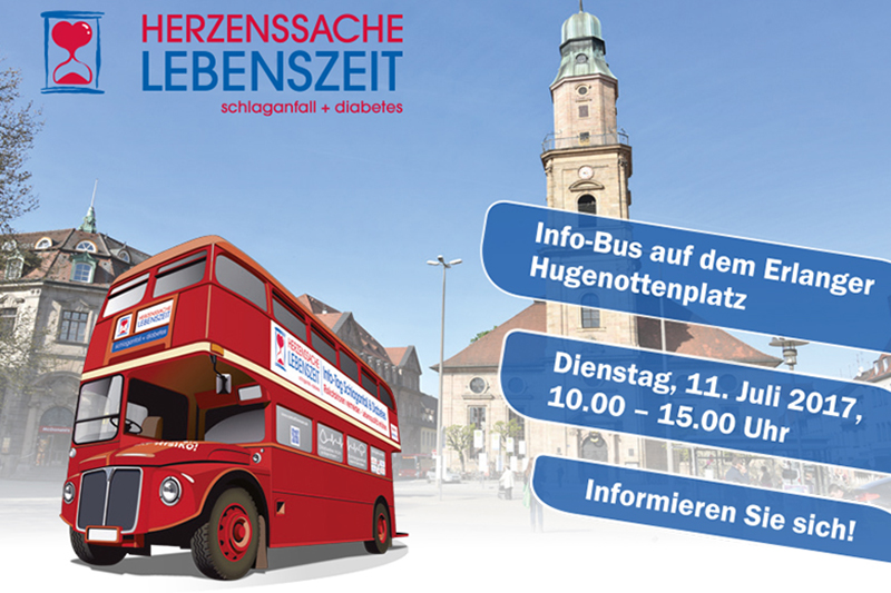 Zwischen Mai und August 2017 tourt ein roter "Schlaganfall-Infobus" unter dem Motto "Herzenssache Lebenszeit" durch Deutschland. Ziel ist es, über die Symptome und Risikofaktoren eines Schlaganfalls zu informieren und die Bevölkerung für die Erkrankung zu sensibilisieren. Am Dienstag, 11. Juli 2017, legt der Bus einen Halt in Erlangen ein. Auf dem Hugenottenplatz informieren Ärzte und Pflegekräfte der Neurologischen Klinik (Direktor: Prof. Dr. Dr. h. c. Stefan Schwab) des Universitätsklinikums Erlangen über Risiken und Prävention eines Schlaganfalls. Auch die Ernährungsberatung der AOK Bayern, Geschäftsstelle Erlangen, und der Kreisverband Erlangen-Höchstadt des Bayerischen Roten Kreuzes beteiligen sich an der Kampagne und beraten Interessierte vor Ort. Unterstützt wird die Aktion auch durch den Erlanger Oberbürgermeister Dr. Florian Janik, der um 12.00 Uhr im Londonbus zu Gast sein wird.
