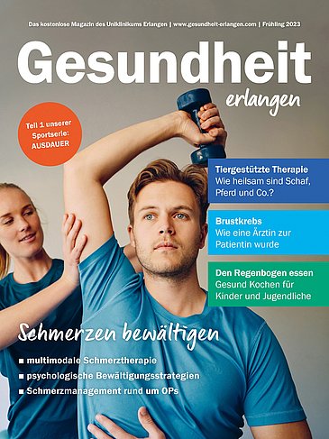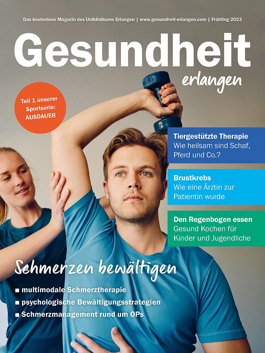 Bei Schmerzen leidet nicht nur der Körper. Soll eine Behandlung wirken, muss sie vor allem bei chronischen Beschwerden auch Psyche und Sozialleben miteinbeziehen. Die Spezialistinnen und Spezialisten des Schmerzzentrums des Uniklinikums Erlangen bieten Betroffenen daher eine multimodale Schmerztherapie an, die alle relevanten Faktoren berücksichtigt. So erläutern Dr. Norbert Grießinger und Dr. Britta Fraunberger, warum es bei Patientinnen und Patienten mit chronischen Beschwerden nicht primäre um die Ursachensuche gehen sollte, sondern vielmehr um den Schmerz an sich, der das eigentliche Problem darstellt. Hierbei kommen verschiedene Bausteine der multimodalen Schmerztherapie zum Einsatz. Eine 43-jährige Patientin berichtet von ihren Erfahrungen in einem tagesklinischen Gruppenprogramm und wie sie es dort schaffte, dem „Schmerzmonster“ das Steuer zu entreißen. Eine wichtige Rolle nimmt dabei auch die psychologische Schmerzbewältigung ein. Der leitende Psychologe im Schmerzzentrum, Peter Mattenklodt, bringt den Leserinnen und Lesern näher, warum das Gehirn mit der Zeit immer sensibler auf den gleichen Schmerzreiz reagiert, und wie wichtig hilfreiche Sätze und die Balance zwischen Aktivität und Ruhe sind. Wie sich Schmerzen nach einer OP gut in den Griff bekommen lassen, warum Patientinnen und Patienten nicht alles aushalten müssen und wie frisch Operierte selbst Einfluss auf ihre Schmerzen nehmen können, darüber sprechen Fachkrankenpfleger Dieter Märkert und Oberarzt Dr. Wolfgang Böswald vom Akutschmerzdienst der Anästhesiologie.