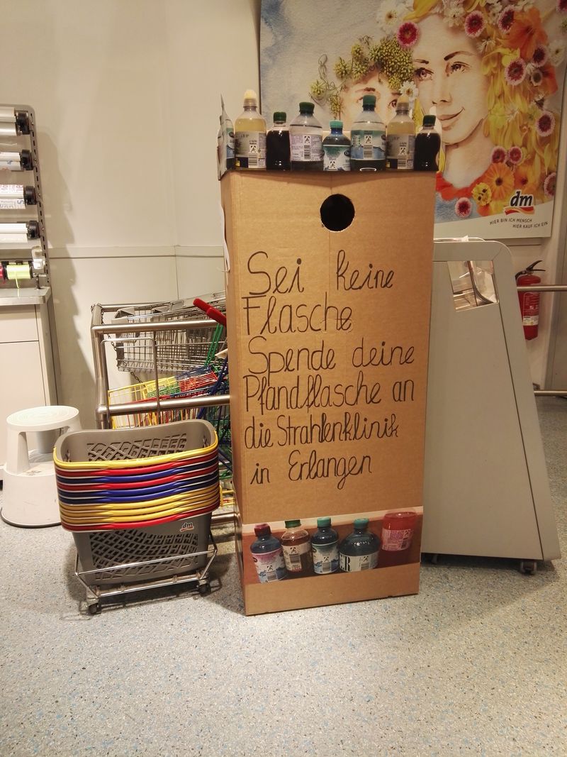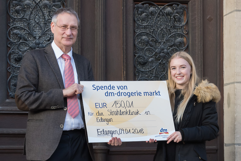 Während ihre Mitauszubildenden mit den Erlösen ihrer Nachhaltigkeitsprojekte - die Bestandteil der Ausbildung sind - vor allem Einrichtungen wie Kindertagesstätten, Schulen und Kindergärten bedachten, wählte Jenny Steiner bewusst aus persönlichen Beweggründen die Strahlenklinik. Unter der Ägide ihrer Ausbilderinnen Judith Bülbül und Tanja Heimburger sammelte sie ab Mitte 2017 im dm-drogerie markt in den Erlangen Arcaden in einem selbst gebastelten "Pfandautomaten" Leergut im Wert von insgesamt 150,01 Euro. Sie freute sich sehr, diesen Betrag nun an Prof. Fietkau übergeben und damit die Strahlenklinik des Uni-Klinikums Erlangen unterstützen zu können.