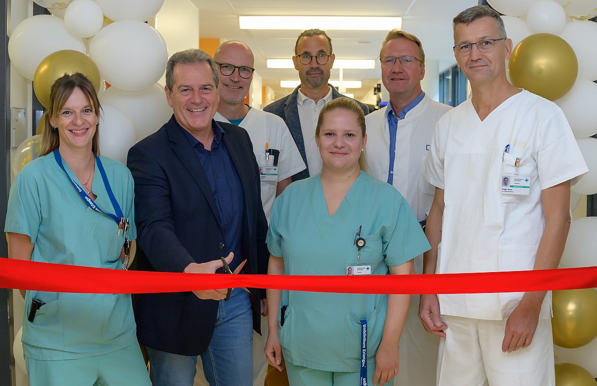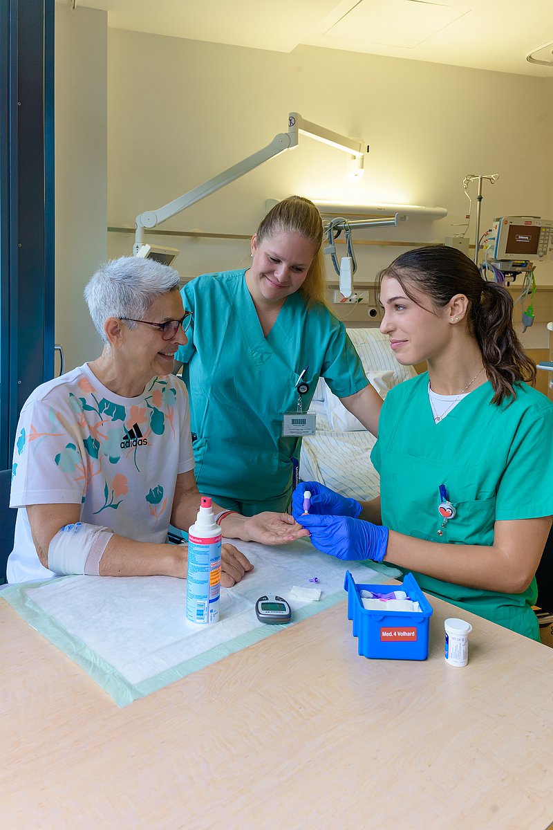 „Eins plus!“, sagt Patientin Dolores O., ohne zu zögern. Sie gibt die Bestnote für die neue Ausbildungsstation der Medizinischen Klinik 4 – Nephrologie und Hypertensiologie (Direktor: Prof. Dr. Mario Schiffer) des Uniklinikums Erlangen. „Die Auszubildenden sind hier so freundlich. Ich kann so viele Fragen stellen, wie ich will – sie beantworten alle. Das Zwischenmenschliche passt einfach“, so die Patientin begeistert. Nach einer dreimonatigen Pilotphase wurde die neue Ausbildungsstation im Internistischen Zentrum jetzt offiziell eröffnet. Hier lernen nun Auszubildende der generalistischen Pflegeausbildung, was Pflege bedeutet – von der Planung der Abläufe über die Organisation bis hin zu eigentlichen Pflegemaßnahmen wie Blutdruckmessen, Wiegen, Verbandswechsel oder Körperpflege. Das Stationsteam betreut u. a. Patientinnen und Patienten mit verschiedenen akuten oder chronischen Nierenerkrankungen und Menschen, die eine Nierentransplantation vor oder bereits hinter sich haben.