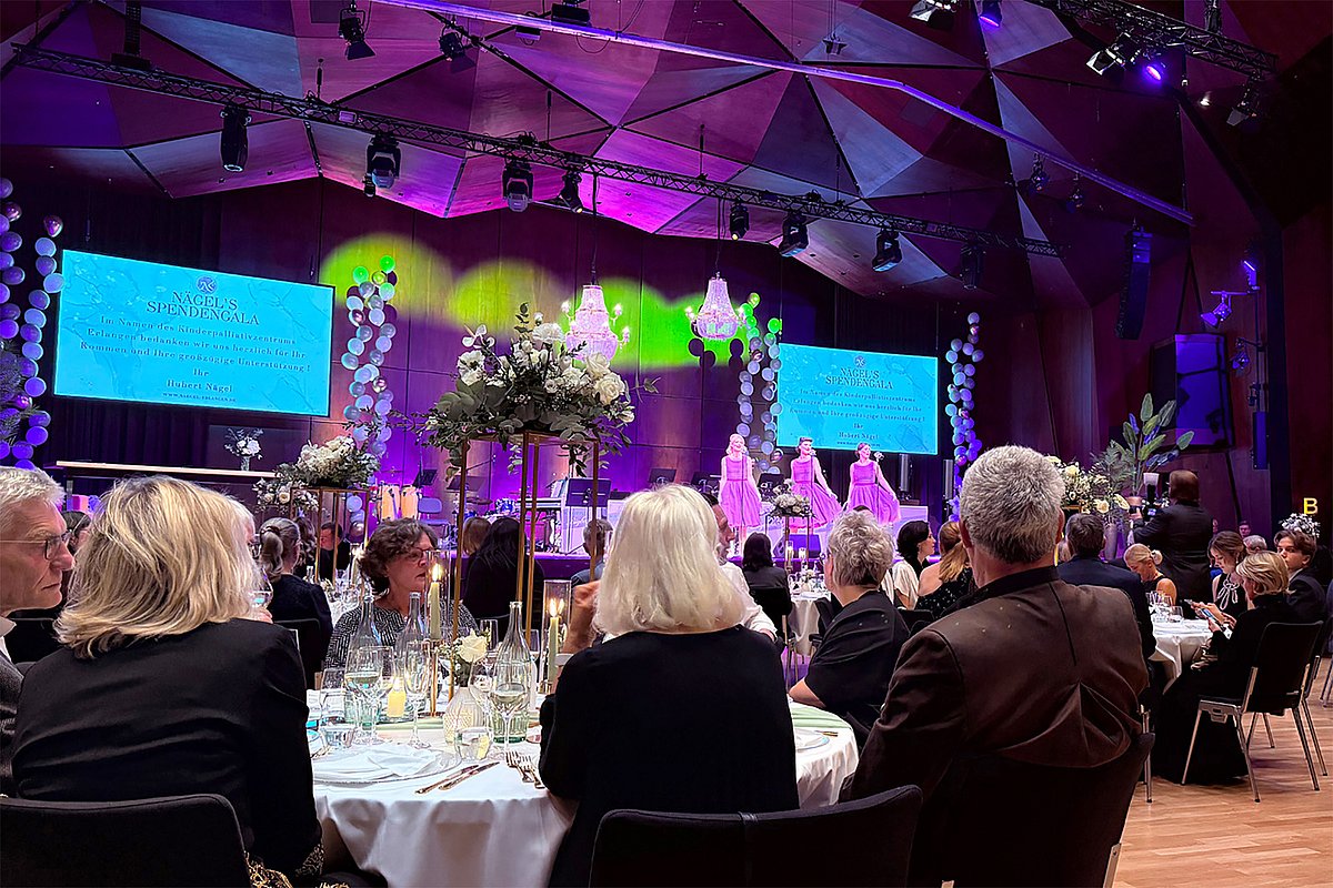 Dr. Gravou-Apostolatou freut sich sehr über die Wertschätzung und die große Spende: „Mithilfe solcher Förderungen können wir das Leben unheilbar erkrankter Kinder und Jugendlicher bis zuletzt lebenswert gestalten. Für unterschiedliche Angebote, etwa die Musik- und die Kunsttherapie, sind wir auf Drittmittel angewiesen, um die Personal- und Materialkosten aufbringen zu können.“ Hubert Nägel, Inhaber von Nägel Ideen und Events GmbH & Co. KG, hatte vom hervorragenden Drei-Gänge-Menü bis zur Show alles organisiert und finanziert. Für den Erlanger Unternehmer war die Spendengala eine Herzensangelegenheit: „Wir machen das aus Überzeugung. Wir brauchen in unserer Gesellschaft Institutionen wie das Kinderpalliativteam und die Arbeit, die durch diese Mitarbeitenden geleistet wird, muss man unterstützen. Dazu benötigt es aber finanzielle Unterstützung und wir versuchen an solchen Abenden ein Zünder zu sein.“