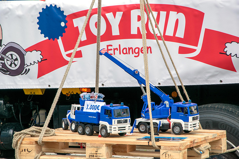 Seit 25 Jahren kommen im Mai traditionell Motorradfahrer aus ganz Deutschland zum Toy Run vor der Kinderklinik des Uni-Klinikums Erlangen zusammen und gestalten ein buntes Programm für die kleinen Patienten und ihre Familien. Zum Schutz vor dem Coronavirus fand dieses Jahr jedoch stattdessen ein Toy-Run-Spendentag statt. Das THW Erlangen unterstützt den vom gleichnamigen Verein organisierten Toy Run zugunsten schwer kranker Kinder und Jugendlicher schon seit Jahren – so auch 2020. Die Einsatzkräfte wollten trotz der Abstands- und eingeschränkten Besuchsregelungen eine Spende überreichen und den jungen Patienten gleichzeitig ein Lächeln auf die Lippen zaubern. Daher entschieden sie sich dazu, die Summe in Höhe von 1.000 Euro, zusammen mit zwei Kippern des THW-Fuhrparks im Kleinformat, aus „sicherer Entfernung“ mit dem Ladekran zu übergeben.