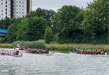 Unter dem Motto "Die Drachen sind los" haben die drei Erlanger Rotary Clubs das 5. Erlanger Benefiz-Drachenbootrennen am 10. Juli 2022 auf dem Main-Donau-Kanal in Erlangen veranstaltet. Die Apotheke des UK Erlangen trat mit dem Boot „APOcalypse“ an den Start und paddelte sich erfolgreich in die erste Tabellenhälfte von insgesamt 19 gemeldeten Teams.