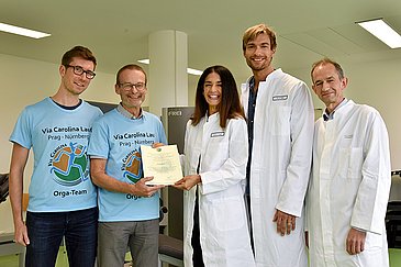 Von Prag bis nach Nürnberg geht man 324 Kilometer. Niemand weiß das so genau, wie die Läufer des jährlichen Via Carolina Laufs, der in 32 Etappen von der tschechischen Hauptstadt bis nach Mittelfranken führt. Am 1. und 2. Juli 2017 traten insgesamt rund 120 Läufer an. Jetzt spendete der ViaCarolinaRunning e. V., vertreten durch die Mitglieder Marc Wallrath und Wolf-Dieter Walter, 500 Euro aus Start- und Spendengeldern an den Verein für Ernährungsmedizin, Bewegung und Sport bei Krebs e. V. am Universitätsklinikum Erlangen. Entgegengenommen wurde die Summe von Prof. Dr. Yurdagül Zopf, Leiterin des Hector-Centers für Ernährung, Bewegung und Sport der Medizinischen Klinik 1 – Gastroenterologie, Pneumologie und Endokrinologie (Direktor: Prof. Dr. Markus F. Neurath).