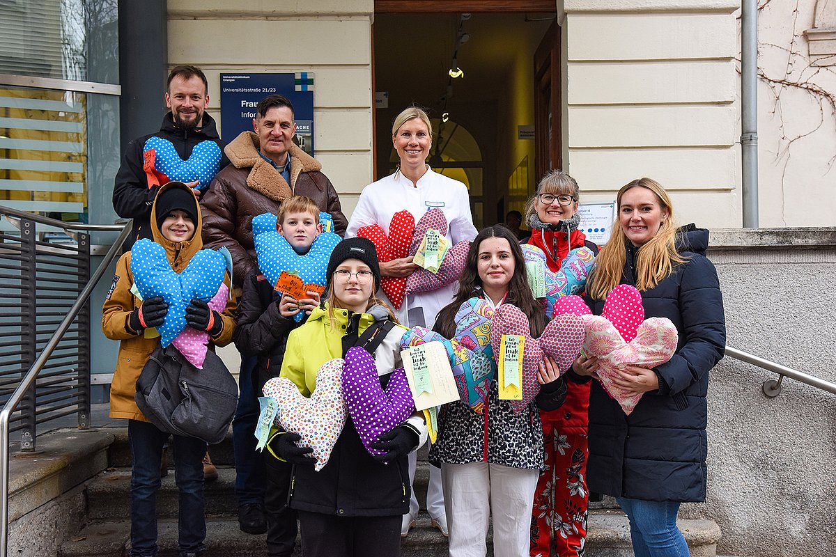 Schülerinnen und Schüler der Georg-Holzbauer-Mittelschule Nürnberg griffen zu Nadel und Faden, um spezielle Herzkissen für Brustkrebspatientinnen zu nähen. Insgesamt 200 liebevoll im Unterricht gefertigte Kissen übergaben sie nun gemeinsam mit ihren Lehrerinnen Anja Farnlucher und Lisa Reger sowie mit Schulleiter Horst Ottmann und seinem Stellvertreter Andreas Müller an PD Dr. Carolin Hack, die sie im Namen der Patientinnen der Frauenklinik (Direktor: Prof. Dr. Matthias W. Beckmann) des Uniklinikums Erlangen entgegennahm: „Wir sind überaus dankbar für die farbenfrohen Handarbeiten, die für unsere Patientinnen eine wichtige seelische Stütze und ein praktischer Alltagshelfer nach der Tumoroperation sind. Als kleines Dankeschön spenden wir 100 Euro an die Klassenkasse der 6b“, so die stellvertretende Klinikdirektorin bei der Kissenübergabe.