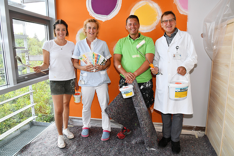 Jetzt entwickelten Malermeisterin Tamara Windisch, Thorsten Prennig und das Team der kinderkardiologischen Station ein neues Farb- und Raumkonzept für das Elternzimmer: Helle Grün-, Blau- und Beerentöne sollen das in die Jahre gekommene, dominante Orange und Rot ersetzen, und mehr Tageslicht darf den Raum erhellen. Für die Kinder wird es eine Tafelwand zum Malen mit Kreide sowie neue Spielsachen geben. Und die jungen Patienten dürfen auch selbst bei der Neugestaltung mitwirken und farbige Handabdrücke an den Wänden hinterlassen. Zehn Jahre lang war das Elternzimmer nicht mehr renoviert worden. „Dieser Raum ist so hilfreich – man ist mal ,raus‘, aber trotzdem noch in der Klinik, in der Nähe seines kranken Kindes“, weiß Thorsten Prennig. „Ich sehe es als Aufgabe von Herzpflaster, Farbe in den Klinikalltag zu bringen – und das tun wir hier gerade im wahrsten Sinne des Wortes!“