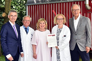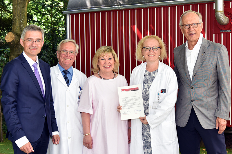 Bei einer Tombola im Rahmen der 1. Rotarischen Wein-Charity auf Schloss Atzelsberg konnten die Rotary-Clubs Erlangen insgesamt 14.000 Euro zusammentragen. Den Erlös spendeten sie nun zweckgebunden an den Freundeskreis der Kinder- und Jugendklinik (Direktor: Prof. Dr. Dr. h. c. Wolfgang Rascher) des Universitätsklinikums Erlangen. Gerswid Herrmann, 1. Vorsitzende des Freundeskreises, nahm das Geld dankend entgegen und übergab es wiederum an das Kinderpalliativteam, vertreten durch Leiterin Dr. Chara Gravou-Apostolatou.