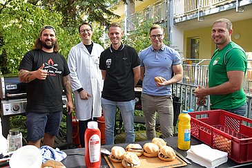 Der Geruch von frisch gegrilltem Gemüse und Bratwürstchen verriet die Aktion, die die Mitglieder des Allgemeinen Sportvereins Weinzierlein-Wintersdorf 1950 e. V. zusammen mit „Michi am Grill“ im Innenhof der Kinder- und Jugendklinik (Direktor: Prof. Dr. Joachim Wölfle) des Uniklinikums Erlangen veranstalteten: Michael Walk-Zigon, Felix Höhn, Lucas Schmutzer und Steffen Ewinger hatten neben dem Erlös des Benefiz-Elfmeterschießens in Höhe von 2.222 Euro noch eine Mittagspausen-Überraschung für die Patientinnen und Patienten sowie die Mitarbeitenden der Kinderklinik in petto. Für sie alle gab es kostenfreie Bratwürstchen und vegetarische Grillpfännchen.