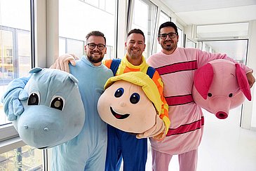 Unzählige High Fives, Umarmungen und begeisterte Kindergesichter: Mit ihrem Walk Act in den Kostümen von Bob der Baumeister, Ferkel und Happy Hippo sorgten Stephan Kortmann, Silvio Rossmann, Jochen Löffelmann und Markus Birkel auf den Stationen der Kinder- und Jugendklinik (Direktor: Prof. Dr. Joachim Wölfle) des Uniklinikums Erlangen für ausgelassene Momente. Die vier Freunde leben im Raum Forchheim und haben zum Teil selbst mit ihren Kindern den Alltag in einer Kinderklinik erfahren müssen. „Wir sind sehr dankbar für die gute Versorgung und das engagierte Pflegepersonal, das Familien in kritischen Situationen unterstützt“, berichtet Stephan Kortmann. „Deshalb wollen wir mit unserem jährlichen Walk Act etwas zurückgeben und den kranken Kindern und Jugendlichen hier ein bisschen Spaß schenken.“