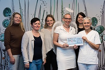 Susanne Singer engagiert sich bei Laufveranstaltungen immer wieder für wohltätige Zwecke. Und sie hat es schon wieder getan: Im Juli dieses Jahres sammelte "Running Angel", so der Aliasname der stets als Engel kostümierten Läuferin, bei einer Tombola im Rahmenprogramm des wohltätigen 2. Deckersberger Inklusionslaufs im Nürnberger Land 1.500 Euro ein. Zugute kommt das Geld jetzt den Pflegekräften der Kinder- und Jugendklinik (Direktor: Prof. Dr. Dr. h. c. Wolfgang Rascher) des Universitätsklinikums Erlangen. "Ich freue mich, mit unserer Spende die wahnsinnig gute Arbeit der Pflegekräfte in der Kinderklinik honorieren und ihnen etwas Gutes tun zu können", sagte sie bei der Spendenübergabe.
