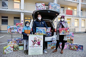 „Auf unseren Stationen behandeln wir aktuell fast zwei Dutzend Kinder mit zum Teil schweren angeborenen Herzfehlern wie einem Loch in der Herzscheidewand oder Fehlbildungen an den Arterien“, berichtet Lennart Heinzel, Psychologe in der Kinderkardiologie des Uni-Klinikums Erlangen. Für genau diese Patientinnen und Patienten überbrachte Thorsten Prennig gemeinsam mit seinem Sohn Finn und Nadine Niedermann im Namen von Herzpflaster e. V. eine Kofferraumladung Spielzeugadventskalender, die täglich eine altersgerechte kleine Überraschung beinhalten. „Manche unserer jungen Patientinnen und Patienten befinden sich schon seit einigen Wochen bei uns; ein Junge sogar bereits seit fünf Monaten“, berichtete Lennart Heinzel bei der Übergabe im Wirtschaftshof der Kinderklinik. „Gerade in der Vorweihnachtszeit, wenn sich das familiäre Leben mehr zu Hause abspielt, ist es für Kinder sehr schwer, getrennt von ihrer Familie im Krankenhaus behandelt zu werden. Deshalb sind solche kleinen Momente der Freude jetzt besonders wichtig.“