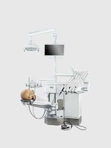 Jede Phantom-Simulationseinheit entspricht von der Ausstattung und der Handhabung exakt einem zahnärztlichen Behandlungsstuhl in der Klinik (Abbildung 1). Mit diesen Behandlungseinheiten können die Studierenden der vorklinischen und klinischen Semester unter fachkundiger Anleitung alle klinischen Arbeitsschritte und Behandlungen, die sie später im klinischen Studienabschnitt selbst am Patienten durchführen werden, unter klinischen Bedingungen üben.