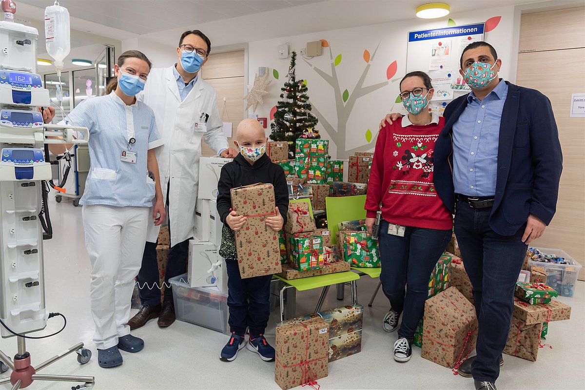 Als ich diesen Wunschzettel las, sind mir die Tränen in die Augen geschossen“, erinnerte sich Jeannine Rauch an den Brief eines jungen Krebspatienten. „Erst hat er ‚Bitte keine Spritzen mehr!‘ geschrieben. Das hat er dann aber durchgestrichen und sich einen riesigen Teddybären gewünscht.“ Für die Fürtherin war es eine Ehrensache, dass dieser kleine Junge nun solch ein großes Kuscheltier zu Weihnachten bekommt. Der Teddy ist nur einer von über 100 Herzenswünschen krebskranker Kinder und Jugendlicher, die Jeannine Rauch und ihr Verlobter Serok Kilic in diesem Jahr erfüllen: Heute überreichte das Fürther Paar 115 Geschenkpäckchen, 110 Gutscheine, 5 Kisten voller Spielzeug für die kommenden Monate sowie 3 Kisten voller Mal- und Bastelmaterialien an Prof. Dr. Markus Metzler, Leiter der Kinderonkologie des Universitätsklinikums Erlangen. Die Spende hat einen Gesamtwert von rund 10.000 Euro und ist schöne Tradition: Es ist bereits das achte Jahr, in dem Jeannine Rauch und Serok Kilic Weihnachtsgeschenke für die Patientinnen und Patienten der Kinderonkologie vorbeibringen.
