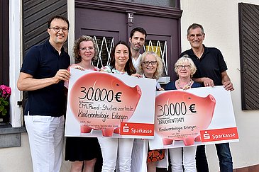 Die Elterninitiative krebskranker Kinder Erlangen e. V. hat ihr Büro in der Loschgestraße, gleich neben dem grünen C-Bau der Kinder- und Jugendklinik (Direktor: Prof. Dr. Joachim Wölfle) des Universitätsklinikums Erlangen. Diese Nähe ist kein Zufall: Seit über 30 Jahren unterstützt der Verein die Familien von an Krebs erkrankten Kinder und nimmt so einen festen Platz im Klinikalltag der Erlanger Kinderonkologie ein. Deren Leiter Prof. Dr. Markus Metzler freute sich jetzt über gleich zwei Spendenschecks, die der 1. Vorstand Jochen Dotterweich übergab: 30.000 Euro gingen an das Brückenteam, das schwerstkranke Kinder und Jugendliche zu Hause besucht und ihnen dadurch so manche Anreise in die Klinik erspart. Weitere 30.000 Euro kommen Prof. Metzlers Forschung zur chronisch myeloischen Leukämie (CML) zugute.
