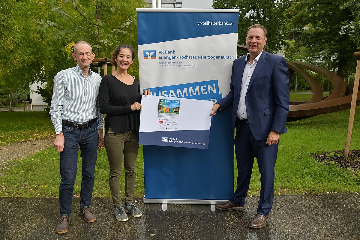 „Keine Sekunde gezögert“ haben nach eigener Aussage die Verantwortlichen der VR-Bank Erlangen-Höchstadt-Herzogenaurach, als es darum ging, den diesjährigen „Lauf gegen Krebs“ zu unterstützen. Das Benefizevent kann 2022 nach zwei Jahren pandemiebedingter Pause endlich wieder im Erlanger Schlossgarten stattfinden. Aus diesem Grund überreichte Jens Böhm, Regionaldirektor Erlangen der VR-Bank, jetzt einen symbolischen Spendenscheck im Wert von 1.500 Euro an Prof. Dr. Yurdagül Zopf, Leiterin des Hector-Centers für Ernährung, Bewegung und Sport des Uniklinikums Erlangen, und Dr. Hans Joachim Herrmann, ernährungswissenschaftlicher Leiter des Hector-Centers. Beide sind Hauptverantwortliche für die Organisation des Laufs.