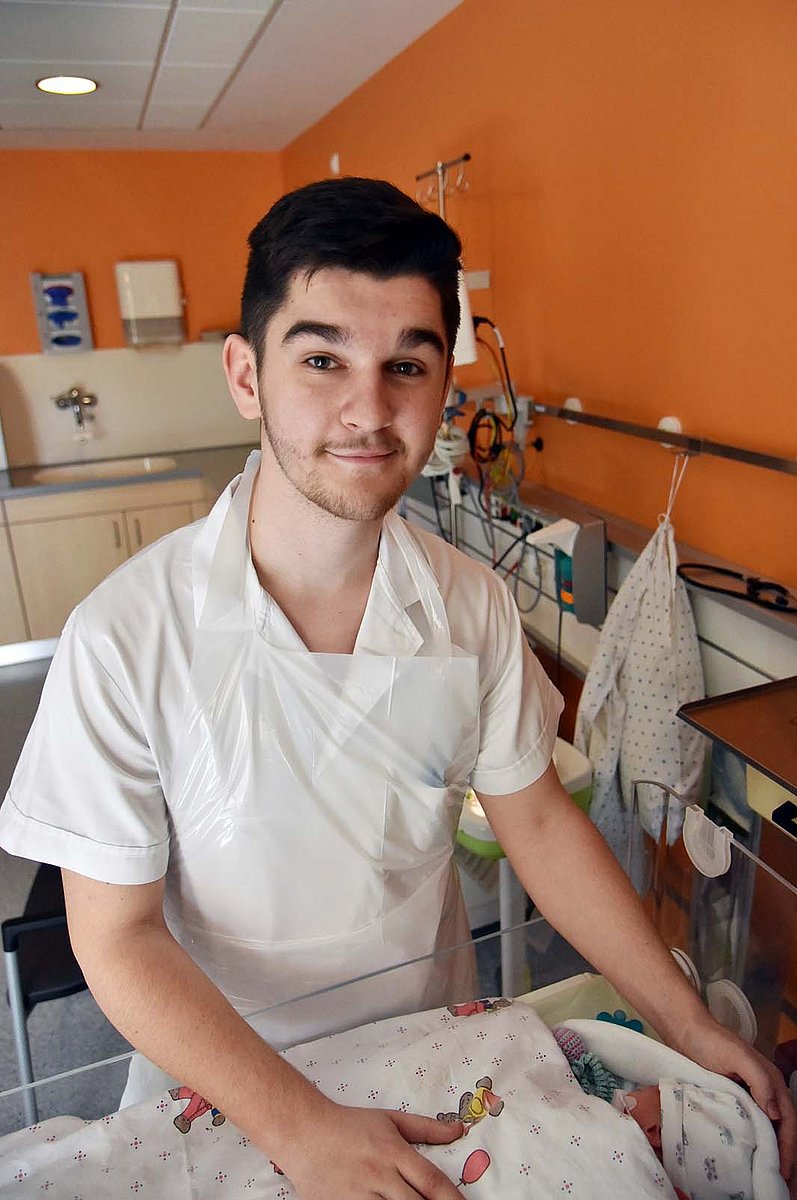 Karlo Grgic absolviert derzeit das dritte Ausbildungsjahr als Pflegefachmann mit der Vertiefung „Pädiatrische Versorgung“ am Uniklinikum Erlangen. Gemeinsam mit 18 weiteren Auszubildenden konnte er nun – wenige Monate vor dem Examen – das Gelernte real anwenden: beim Praxisprojekt „Auszubildende leiten eine Station“ in der Kinder- und Jugendklinik (Direktor: Prof. Dr. Joachim Wölfle) des Uniklinikums Erlangen. Zwei Wochen lang organisieren hier Auszubildende selbstständig die Abläufe auf der Station Neonatologie 2, treffen Entscheidungen und versorgen die Neugeborenen. „Diese wertvolle Erfahrung ist seit vielen Jahren fester Bestandteil unserer Pflegeausbildung“, erklärt Carmen Stöcker, zentrale Praxisanleiterin der Station Neonatologie 2. „Das gesamte Stationsteam unterstützt unsere Nachwuchskräfte in dieser Zeit dabei, die tägliche Verantwortung ihres künftigen Berufs im klinischen Alltag zu erleben.“