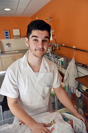 Vor sechs Jahren fand der Kroate Karlo Grgic mit seinen Eltern einen neuen Lebensmittelpunkt in Nürnberg, von wo er jetzt täglich zum Uniklinikum Erlangen pendelt. Dass sein künftiger Beruf in jedem Fall mit Kindern zu tun haben sollte, stand für den heute 20-Jährigen schon immer fest. „Der wichtigste Grund für diese Ausbildung ist meine Liebe zu Kindern. Ich habe in Zagreb eine große Verwandtschaft, und dort oft meine jungen Cousins und Cousinen betreut“, berichtet er lächelnd. „Da ich auch immer viel Interesse an der Medizin hatte, entschied ich mich nach dem Realschulabschluss für ein Praktikum am Uniklinikum Erlangen. Gleich danach habe ich mich um einen Ausbildungsplatz zum Pflegefachmann beworben.“ Das Praxisprojekt „Auszubildende leiten eine Station“ sieht Karlo Grgic als wertvolle Vorbereitung für sein anstehendes Examen. „Das ist wirklich unglaublich hilfreich, weil wir dabei lernen, komplett eigenverantwortlich und im Team zu arbeiten.“
