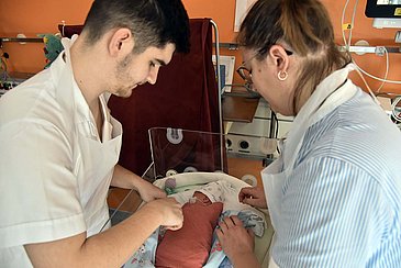„Bei allen Handlungen der Auszubildenden an unseren jüngsten Patientinnen und Patienten stehen wir begleitend im Hintergrund“, erläutert Carmen Stöcker und beobachtet aufmerksam, wie Karlo Grgic und seine Kollegin Konstantina Kinski ein drei Wochen altes Frühchen über eine Magensonde mit Muttermilch versorgen und anschließend vorsichtig in sein Bettchen legen. „Für die Stationsleitung Marianne Bust und ihr Team bedeuten diese beiden Projektwochen einiges an Mehrarbeit. Deshalb freue ich mich immer wieder darüber, dass das gesamte Stationsteam das Projekt aus voller Überzeugung und zusätzlich zu den eigentlichen Aufgaben unterstützt“, betont die zentrale Praxisanleiterin.